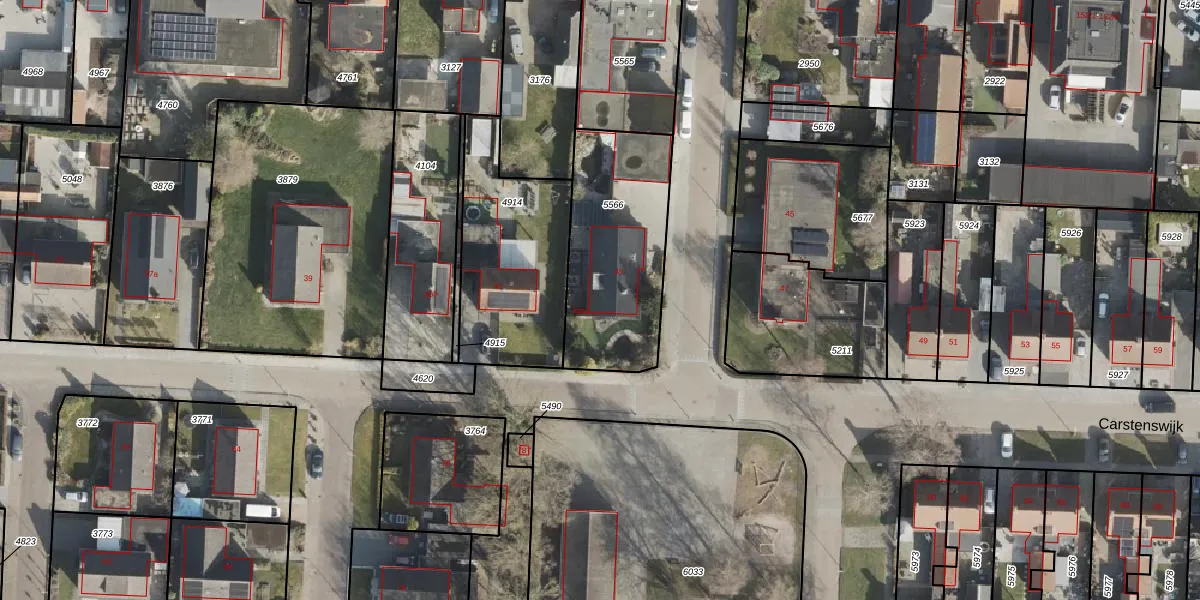Het perceel waarop Carstenswijk 43 staat heeft een oppervlakte van 626 m². Dit is een groot perceel. De perceeloppervlakte wordt geregistreerd door het Kadaster. Gedetailleerde informatie over de maten van dit perceel kunt u vinden in het rapport Kadastrale kaart met maatvoering van Carstenswijk 43.
