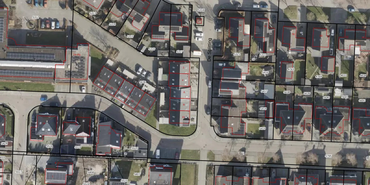 Het perceel waarop De Splitting 6 staat heeft een oppervlakte van 2694 m². Dit is een zeer groot perceel. De perceeloppervlakte wordt geregistreerd door het Kadaster. Gedetailleerde informatie over de maten van dit perceel kunt u vinden in het rapport Kadastrale kaart met maatvoering van De Splitting 6.