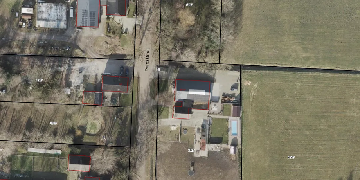 Het perceel waarop Dorpsstraat 55 staat heeft een oppervlakte van 3725 m². Dit is een zeer groot perceel. De perceeloppervlakte wordt geregistreerd door het Kadaster. Gedetailleerde informatie over de maten van dit perceel kunt u vinden in het rapport Kadastrale kaart met maatvoering van Dorpsstraat 55.
