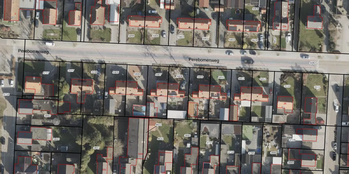 Perebomenweg 16 is gelegen op kadastraal perceel HGV00M5908. Deze kadastrale aanduiding is uniek en wordt gebruikt door het Kadaster om eigendomsrechten en andere zakelijke rechten vast te leggen. Het perceel maakt onderdeel uit van de kadastrale gemeente Hoogeveen.