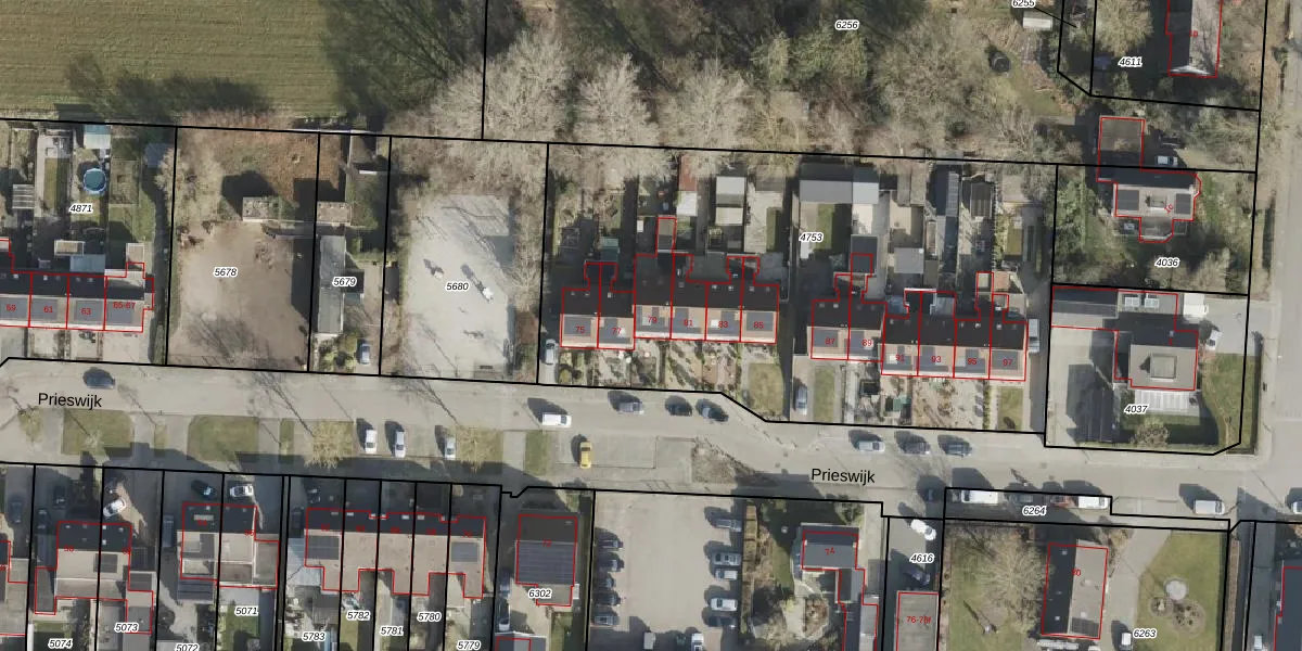 Het perceel waarop Prieswijk 79 staat heeft een oppervlakte van 3104 m². Dit is een zeer groot perceel. De perceeloppervlakte wordt geregistreerd door het Kadaster. Gedetailleerde informatie over de maten van dit perceel kunt u vinden in het rapport Kadastrale kaart met maatvoering van Prieswijk 79.