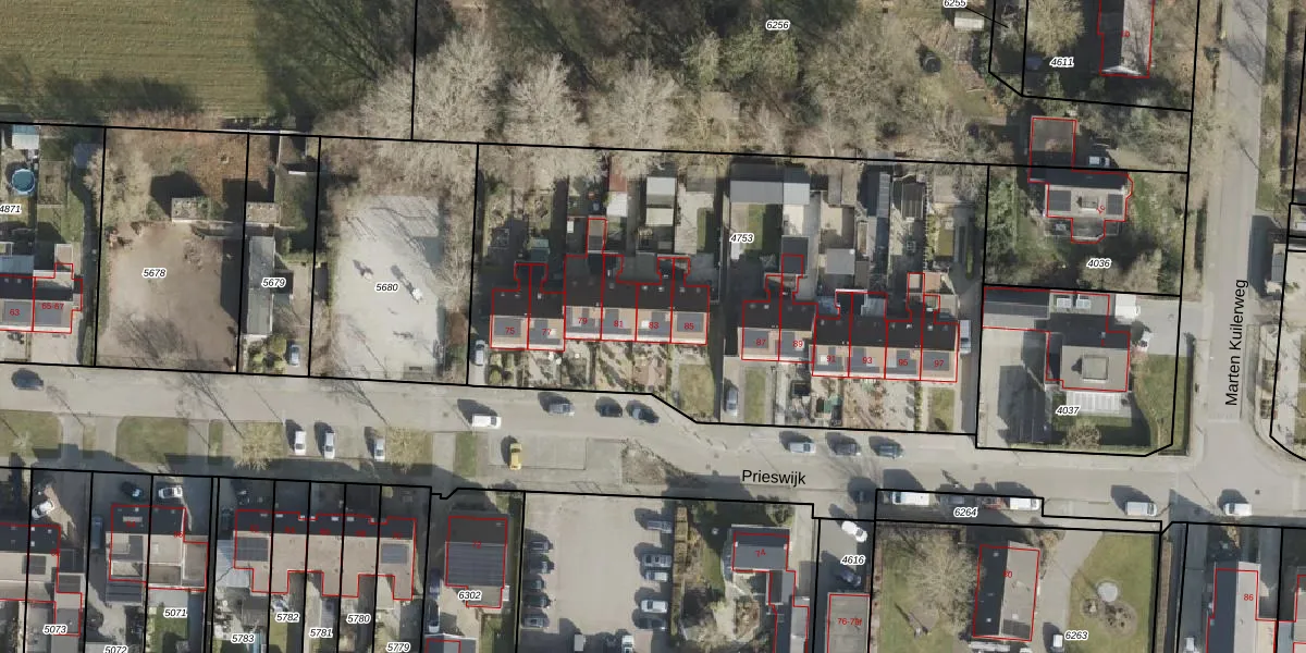Het perceel waarop Prieswijk 83 staat heeft een oppervlakte van 3104 m². Dit is een zeer groot perceel. De perceeloppervlakte wordt geregistreerd door het Kadaster. Gedetailleerde informatie over de maten van dit perceel kunt u vinden in het rapport Kadastrale kaart met maatvoering van Prieswijk 83.