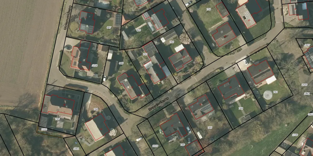 Het perceel waarop Breederkamp 22 staat heeft een oppervlakte van 612 m². Dit is een groot perceel. De perceeloppervlakte wordt geregistreerd door het Kadaster. Gedetailleerde informatie over de maten van dit perceel kunt u vinden in het rapport Kadastrale kaart met maatvoering van Breederkamp 22.