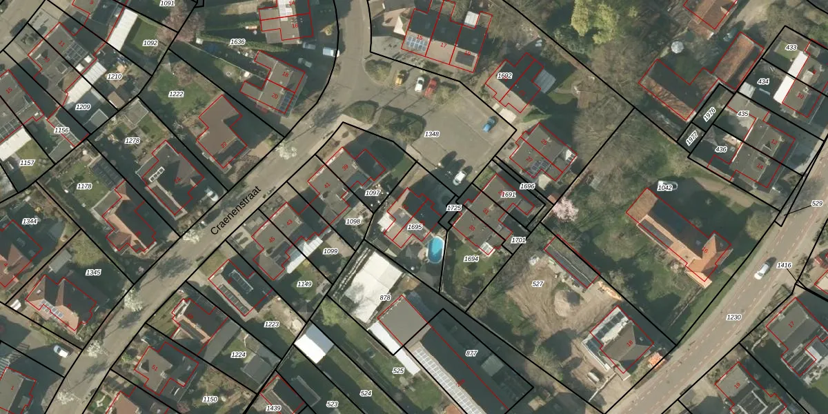 Het perceel waarop Craenenstraat 37 staat heeft een oppervlakte van 383 m². Dit is een groot perceel. De perceeloppervlakte wordt geregistreerd door het Kadaster. Gedetailleerde informatie over de maten van dit perceel kunt u vinden in het rapport Kadastrale kaart met maatvoering van Craenenstraat 37.