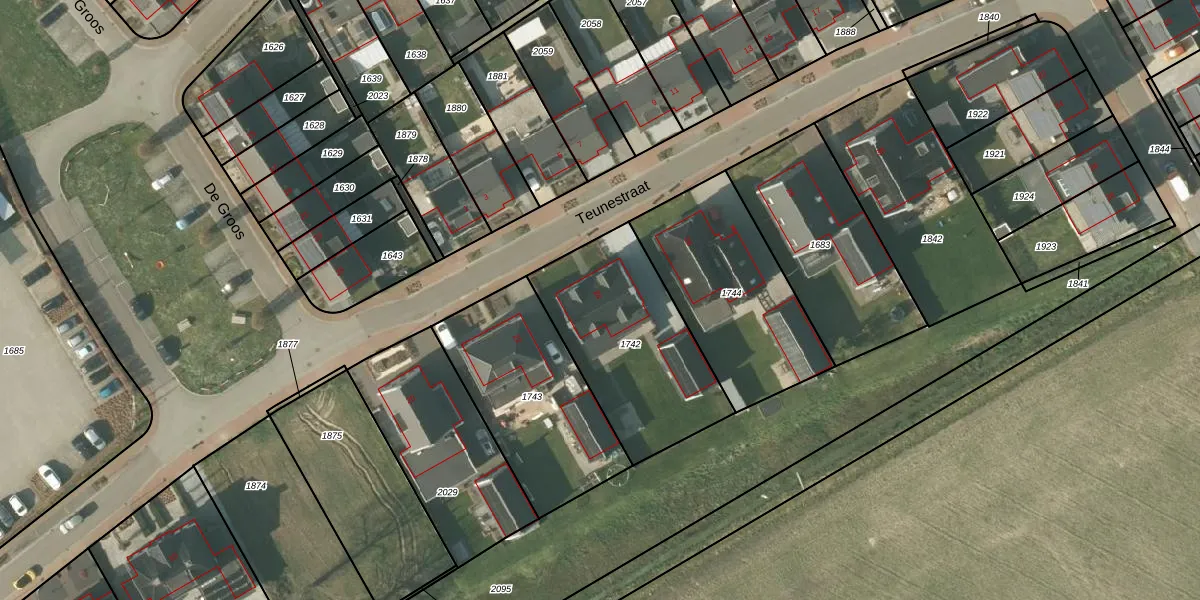 Het perceel waarop Teunestraat 24 staat heeft een oppervlakte van 701 m². Dit is een groot perceel. De perceeloppervlakte wordt geregistreerd door het Kadaster. Gedetailleerde informatie over de maten van dit perceel kunt u vinden in het rapport Kadastrale kaart met maatvoering van Teunestraat 24.
