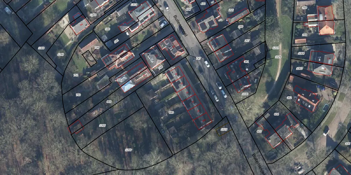 Het perceel waarop Buitensingel 32 staat heeft een oppervlakte van 1507 m². Dit is een zeer groot perceel. De perceeloppervlakte wordt geregistreerd door het Kadaster. Gedetailleerde informatie over de maten van dit perceel kunt u vinden in het rapport Kadastrale kaart met maatvoering van Buitensingel 32.