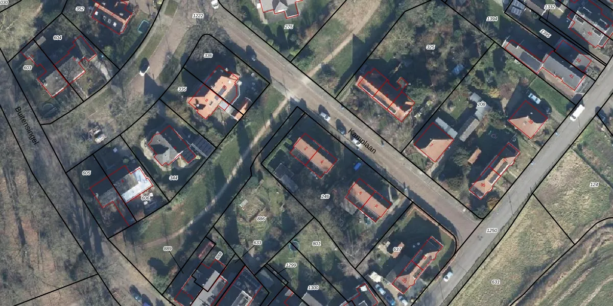 Het perceel waarop Kamplaan 2 staat heeft een oppervlakte van 1100 m². Dit is een zeer groot perceel. De perceeloppervlakte wordt geregistreerd door het Kadaster. Gedetailleerde informatie over de maten van dit perceel kunt u vinden in het rapport Kadastrale kaart met maatvoering van Kamplaan 2.