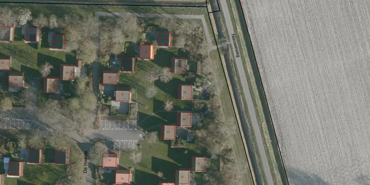 Het perceel waarop De Haerde 69 staat heeft een oppervlakte van 6,1 ha. Dit is een zeer groot perceel. De perceeloppervlakte wordt geregistreerd door het Kadaster. Gedetailleerde informatie over de maten van dit perceel kunt u vinden in het rapport Kadastrale kaart met maatvoering van De Haerde 69.