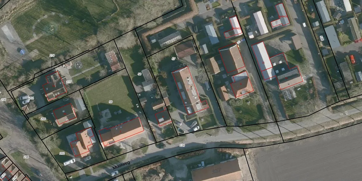 Het perceel waarop Moolweg 7-0005 staat heeft een oppervlakte van 1380 m². Dit is een zeer groot perceel. De perceeloppervlakte wordt geregistreerd door het Kadaster. Gedetailleerde informatie over de maten van dit perceel kunt u vinden in het rapport Kadastrale kaart met maatvoering van Moolweg 7-0005.