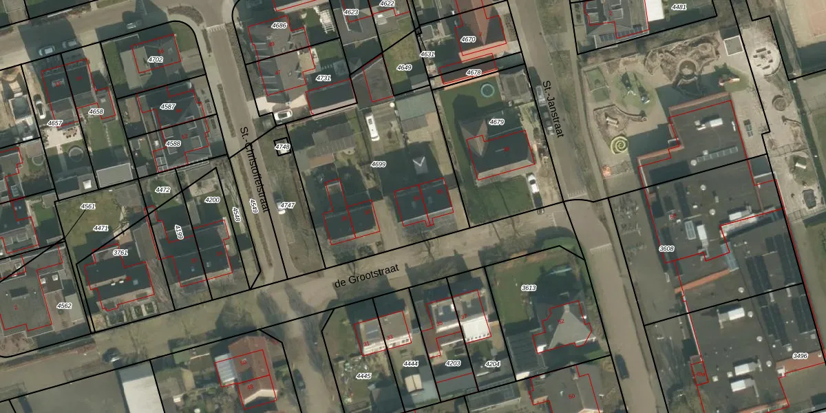 Het perceel waarop de Grootstraat 34 staat heeft een oppervlakte van 1387 m². Dit is een zeer groot perceel. De perceeloppervlakte wordt geregistreerd door het Kadaster. Gedetailleerde informatie over de maten van dit perceel kunt u vinden in het rapport Kadastrale kaart met maatvoering van de Grootstraat 34.