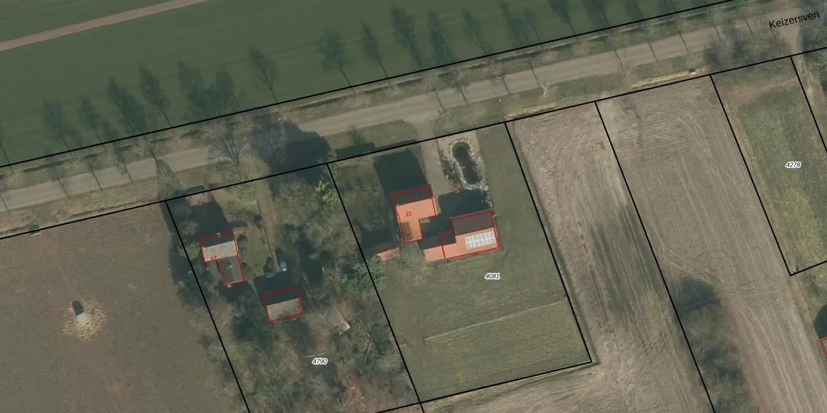 Het perceel waarop Keizersven 21 staat heeft een oppervlakte van 2650 m². Dit is een zeer groot perceel. De perceeloppervlakte wordt geregistreerd door het Kadaster. Gedetailleerde informatie over de maten van dit perceel kunt u vinden in het rapport Kadastrale kaart met maatvoering van Keizersven 21.