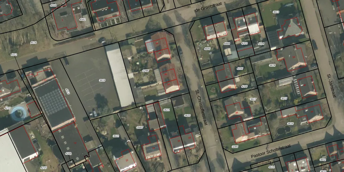 St.-Christoffelstraat 44 is gelegen op kadastraal perceel GMT00C3286. Deze kadastrale aanduiding is uniek en wordt gebruikt door het Kadaster om eigendomsrechten en andere zakelijke rechten vast te leggen. Het perceel maakt onderdeel uit van de kadastrale gemeente Gemert.