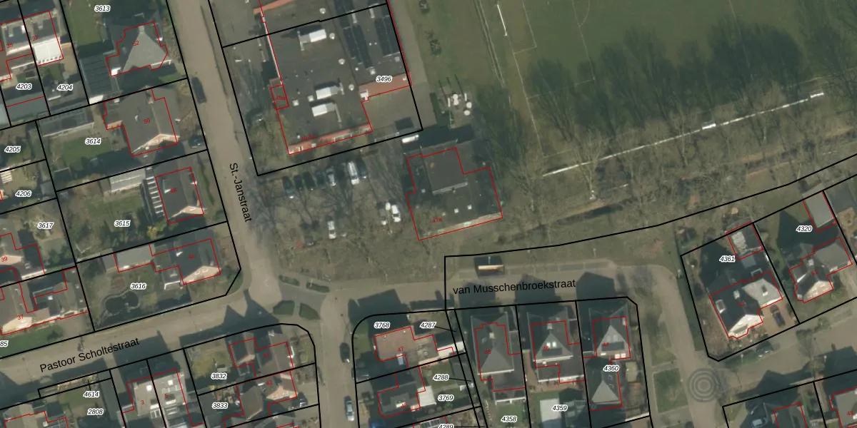 Het perceel waarop St.-Janstraat 47-a staat heeft een oppervlakte van 3,3 ha. Dit is een zeer groot perceel. De perceeloppervlakte wordt geregistreerd door het Kadaster. Gedetailleerde informatie over de maten van dit perceel kunt u vinden in het rapport Kadastrale kaart met maatvoering van St.-Janstraat 47-a.