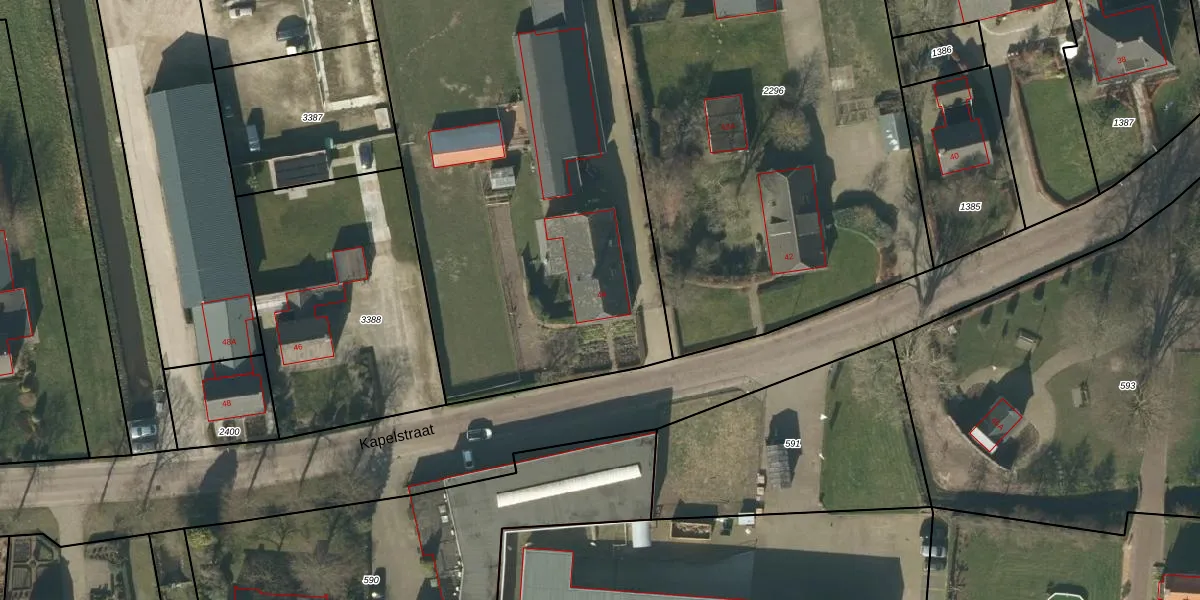 Het perceel waarop Kapelstraat 44 staat heeft een oppervlakte van 3423 m². Dit is een zeer groot perceel. De perceeloppervlakte wordt geregistreerd door het Kadaster. Gedetailleerde informatie over de maten van dit perceel kunt u vinden in het rapport Kadastrale kaart met maatvoering van Kapelstraat 44.