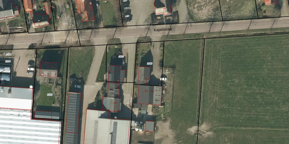 Het perceel waarop Kapelstraat 55-A staat heeft een oppervlakte van 570 m². Dit is een groot perceel. De perceeloppervlakte wordt geregistreerd door het Kadaster. Gedetailleerde informatie over de maten van dit perceel kunt u vinden in het rapport Kadastrale kaart met maatvoering van Kapelstraat 55-A.