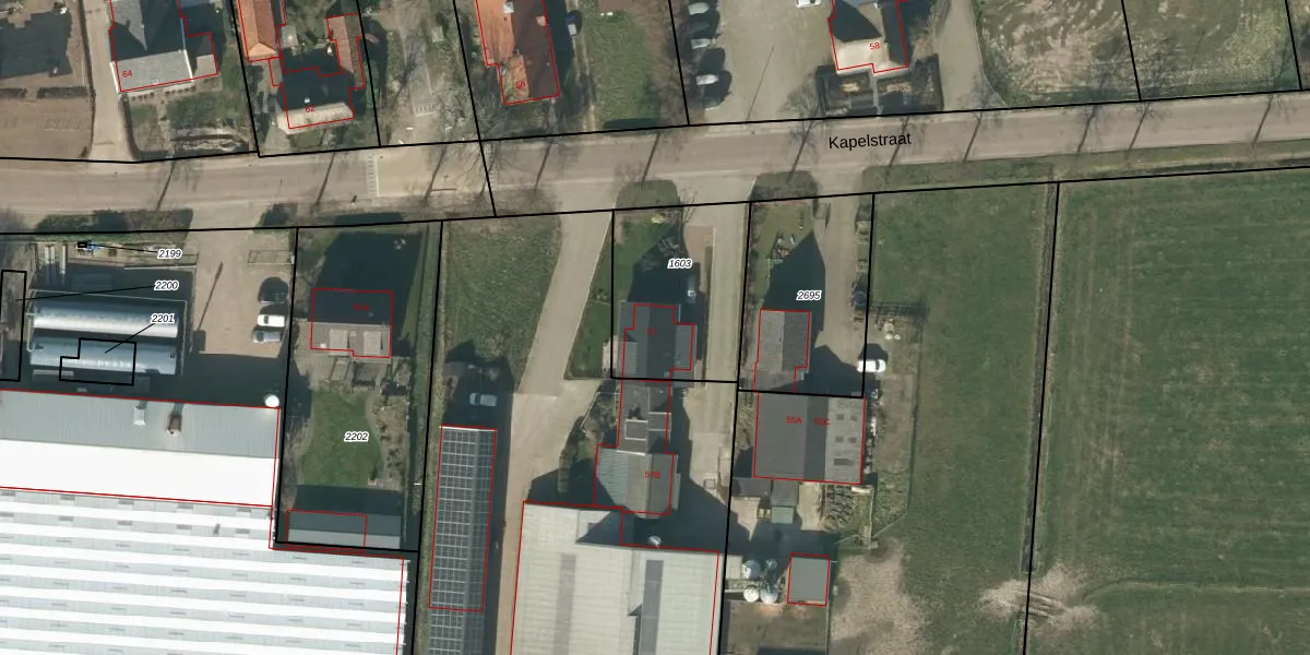 Kapelstraat 57 is gelegen op kadastraal perceel DNN00K1603. Deze kadastrale aanduiding is uniek en wordt gebruikt door het Kadaster om eigendomsrechten en andere zakelijke rechten vast te leggen. Het perceel maakt onderdeel uit van de kadastrale gemeente Drunen.