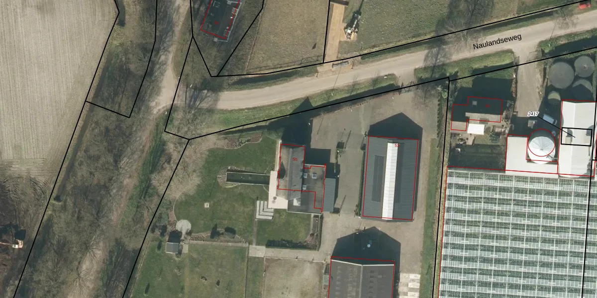 Het perceel waarop Naulandseweg 55 staat heeft een oppervlakte van 2,8 ha. Dit is een zeer groot perceel. De perceeloppervlakte wordt geregistreerd door het Kadaster. Gedetailleerde informatie over de maten van dit perceel kunt u vinden in het rapport Kadastrale kaart met maatvoering van Naulandseweg 55.