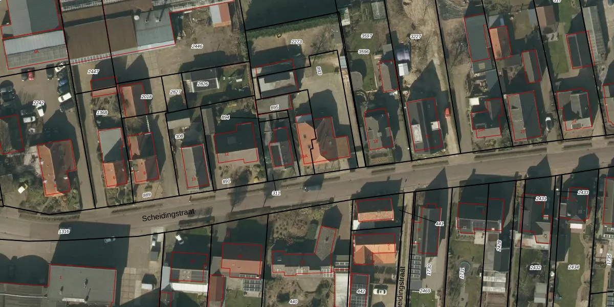 Scheidingstraat 16-A is gelegen op kadastraal perceel DNN00K895. Deze kadastrale aanduiding is uniek en wordt gebruikt door het Kadaster om eigendomsrechten en andere zakelijke rechten vast te leggen. Het perceel maakt onderdeel uit van de kadastrale gemeente Drunen.
