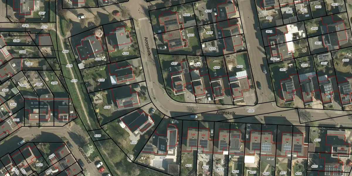 Het perceel waarop Aronskelk 115 staat heeft een oppervlakte van 422 m². Dit is een groot perceel. De perceeloppervlakte wordt geregistreerd door het Kadaster. Gedetailleerde informatie over de maten van dit perceel kunt u vinden in het rapport Kadastrale kaart met maatvoering van Aronskelk 115.