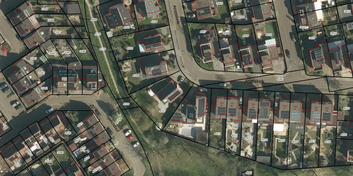 Het perceel waarop Aronskelk 144 staat heeft een oppervlakte van 595 m². Dit is een groot perceel. De perceeloppervlakte wordt geregistreerd door het Kadaster. Gedetailleerde informatie over de maten van dit perceel kunt u vinden in het rapport Kadastrale kaart met maatvoering van Aronskelk 144.