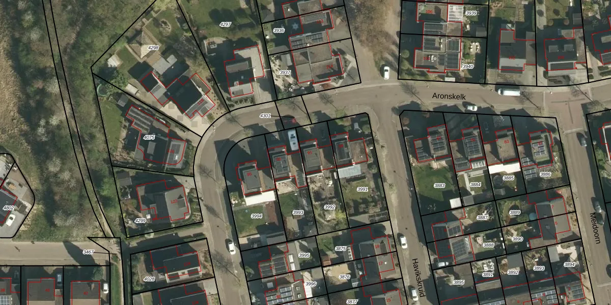 Het perceel waarop Aronskelk 91 staat heeft een oppervlakte van 375 m². Dit is een groot perceel. De perceeloppervlakte wordt geregistreerd door het Kadaster. Gedetailleerde informatie over de maten van dit perceel kunt u vinden in het rapport Kadastrale kaart met maatvoering van Aronskelk 91.