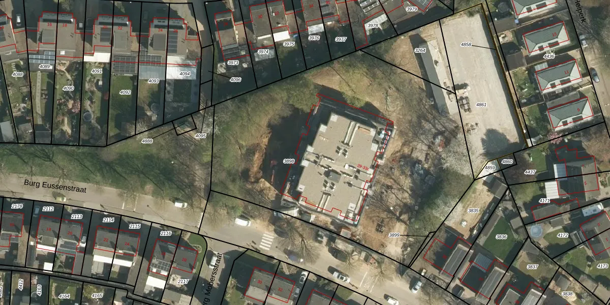 Het perceel waarop Burg Eussenstraat 29-d staat heeft een oppervlakte van 4074 m². Dit is een zeer groot perceel. De perceeloppervlakte wordt geregistreerd door het Kadaster. Gedetailleerde informatie over de maten van dit perceel kunt u vinden in het rapport Kadastrale kaart met maatvoering van Burg Eussenstraat 29-d.