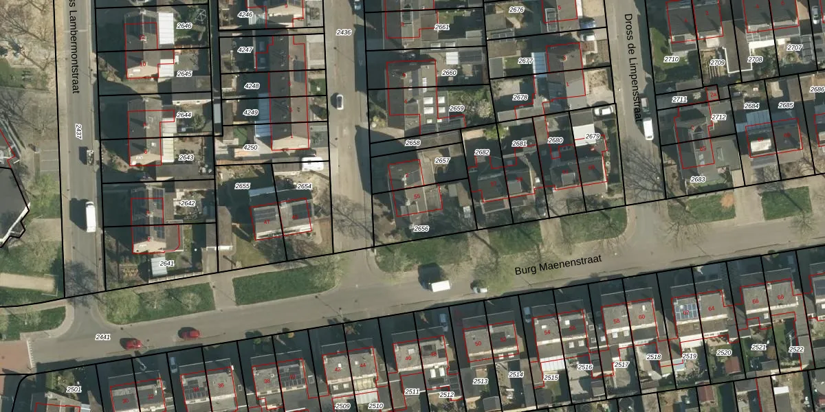 Het perceel waarop Burg Maenenstraat 55 staat heeft een oppervlakte van 316 m². Dit is een groot perceel. De perceeloppervlakte wordt geregistreerd door het Kadaster. Gedetailleerde informatie over de maten van dit perceel kunt u vinden in het rapport Kadastrale kaart met maatvoering van Burg Maenenstraat 55.