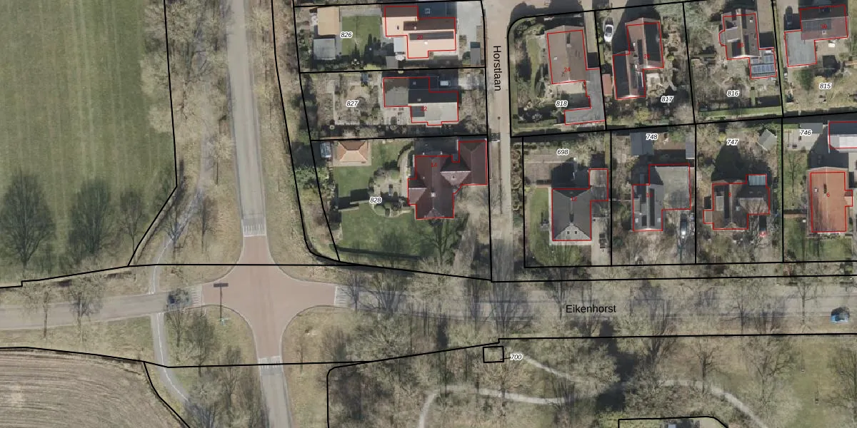 Het perceel waarop Eikenhorst 14 staat heeft een oppervlakte van 1204 m². Dit is een zeer groot perceel. De perceeloppervlakte wordt geregistreerd door het Kadaster. Gedetailleerde informatie over de maten van dit perceel kunt u vinden in het rapport Kadastrale kaart met maatvoering van Eikenhorst 14.