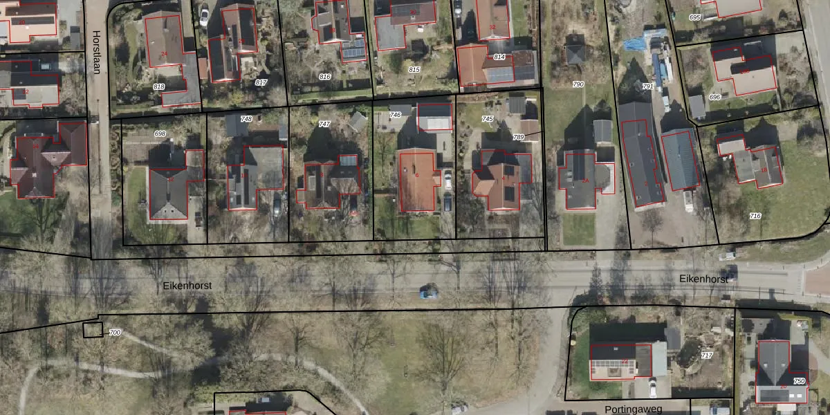 Het perceel waarop Eikenhorst 6 staat heeft een oppervlakte van 725 m². Dit is een groot perceel. De perceeloppervlakte wordt geregistreerd door het Kadaster. Gedetailleerde informatie over de maten van dit perceel kunt u vinden in het rapport Kadastrale kaart met maatvoering van Eikenhorst 6.