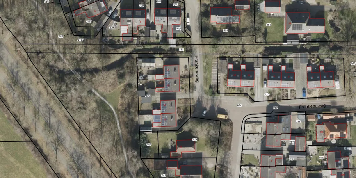 Frankenaweg 16 is gelegen op kadastraal perceel MKG00F435. Deze kadastrale aanduiding is uniek en wordt gebruikt door het Kadaster om eigendomsrechten en andere zakelijke rechten vast te leggen. Het perceel maakt onderdeel uit van de kadastrale gemeente Makkinga.