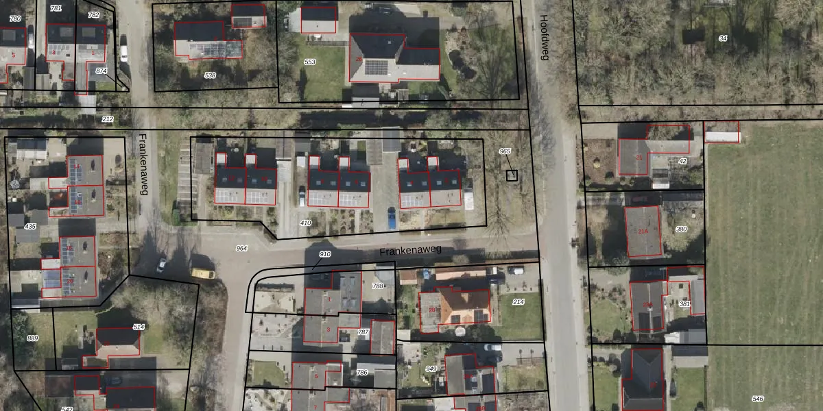 Het perceel waarop Frankenaweg 4 staat heeft een oppervlakte van 1586 m². Dit is een zeer groot perceel. De perceeloppervlakte wordt geregistreerd door het Kadaster. Gedetailleerde informatie over de maten van dit perceel kunt u vinden in het rapport Kadastrale kaart met maatvoering van Frankenaweg 4.