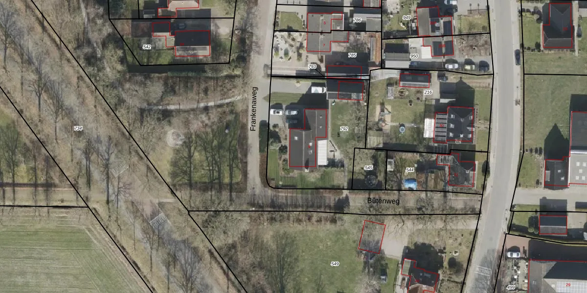 Frankenaweg 9 is gelegen op kadastraal perceel MKG00F792. Deze kadastrale aanduiding is uniek en wordt gebruikt door het Kadaster om eigendomsrechten en andere zakelijke rechten vast te leggen. Het perceel maakt onderdeel uit van de kadastrale gemeente Makkinga.