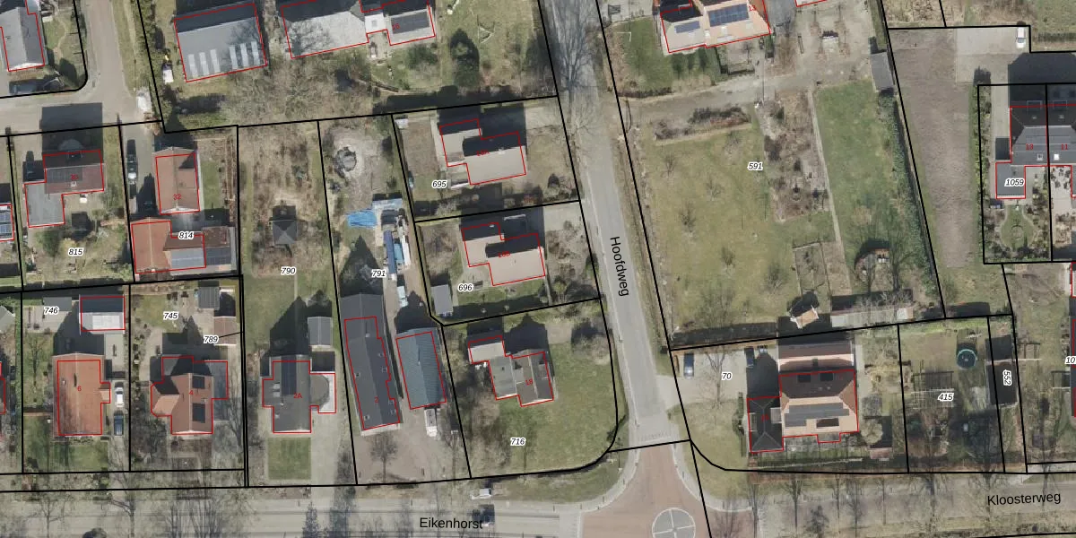 Het perceel waarop Hoofdweg 16-B staat heeft een oppervlakte van 595 m². Dit is een groot perceel. De perceeloppervlakte wordt geregistreerd door het Kadaster. Gedetailleerde informatie over de maten van dit perceel kunt u vinden in het rapport Kadastrale kaart met maatvoering van Hoofdweg 16-B.