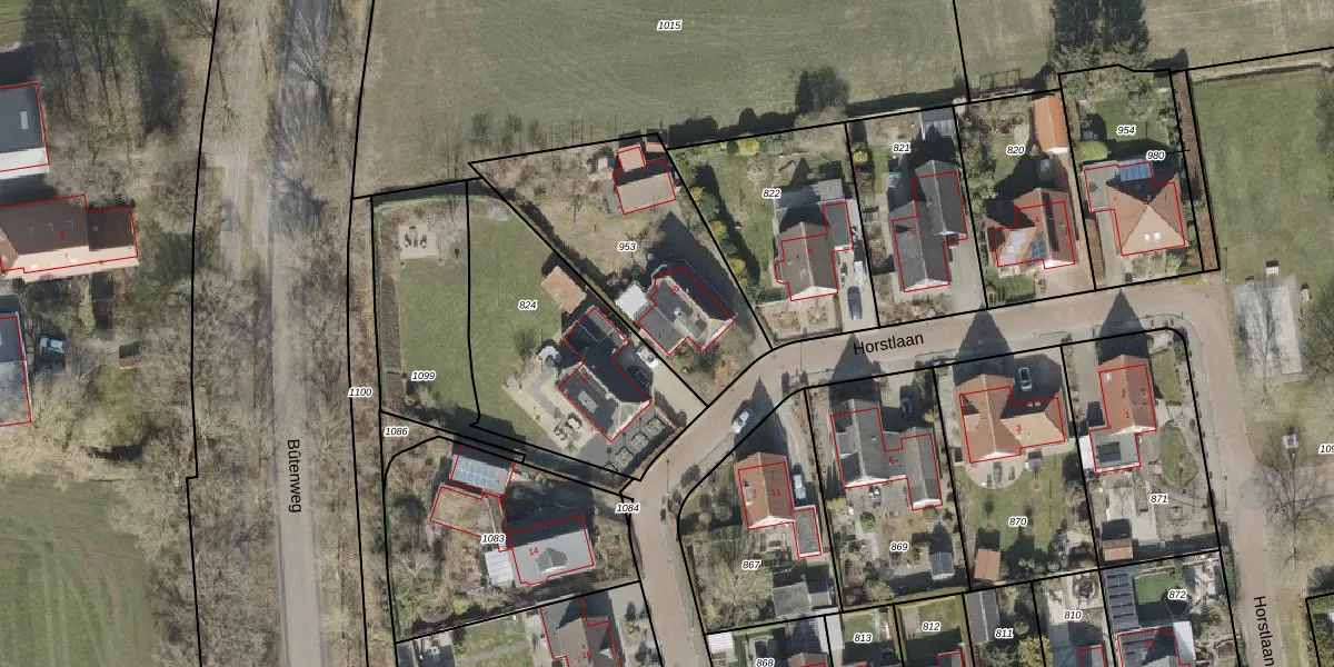 Het perceel waarop Horstlaan 10 staat heeft een oppervlakte van 825 m². Dit is een groot perceel. De perceeloppervlakte wordt geregistreerd door het Kadaster. Gedetailleerde informatie over de maten van dit perceel kunt u vinden in het rapport Kadastrale kaart met maatvoering van Horstlaan 10.