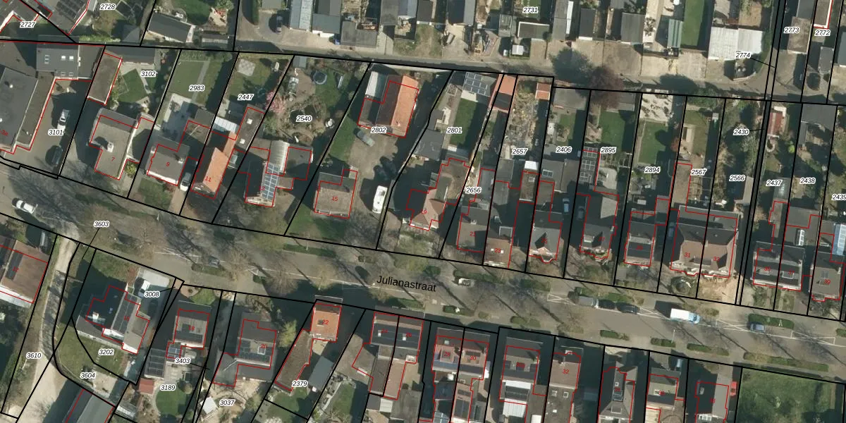 Het perceel waarop Julianastraat 19 staat heeft een oppervlakte van 620 m². Dit is een groot perceel. De perceeloppervlakte wordt geregistreerd door het Kadaster. Gedetailleerde informatie over de maten van dit perceel kunt u vinden in het rapport Kadastrale kaart met maatvoering van Julianastraat 19.
