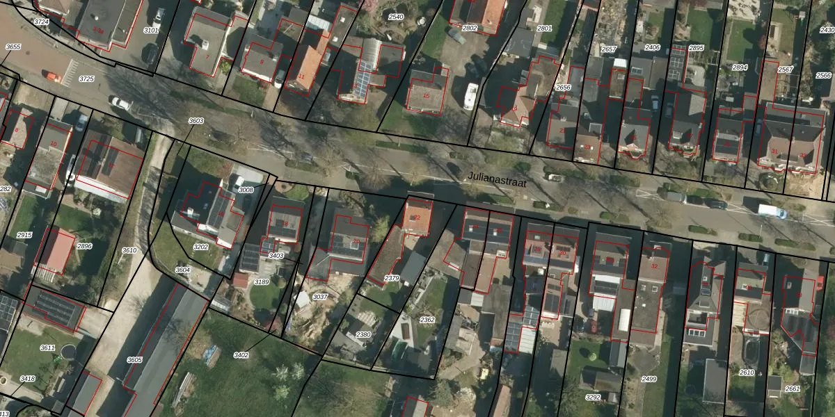 Het perceel waarop Julianastraat 22 staat heeft een oppervlakte van 320 m². Dit is een groot perceel. De perceeloppervlakte wordt geregistreerd door het Kadaster. Gedetailleerde informatie over de maten van dit perceel kunt u vinden in het rapport Kadastrale kaart met maatvoering van Julianastraat 22.