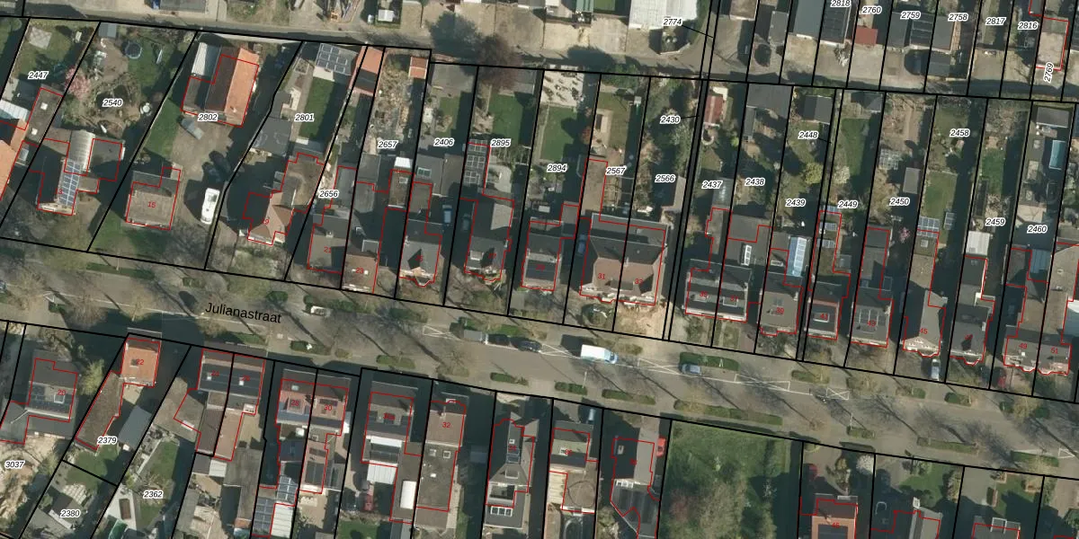 Het perceel waarop Julianastraat 29 staat heeft een oppervlakte van 484 m². Dit is een groot perceel. De perceeloppervlakte wordt geregistreerd door het Kadaster. Gedetailleerde informatie over de maten van dit perceel kunt u vinden in het rapport Kadastrale kaart met maatvoering van Julianastraat 29.