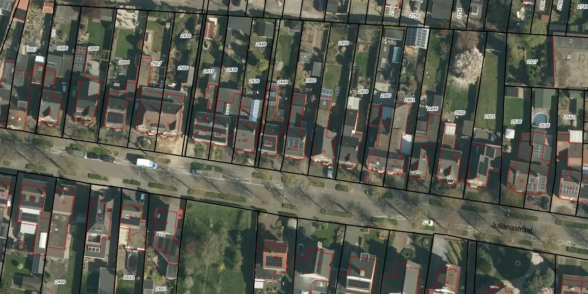 Het perceel waarop Julianastraat 43 staat heeft een oppervlakte van 470 m². Dit is een groot perceel. De perceeloppervlakte wordt geregistreerd door het Kadaster. Gedetailleerde informatie over de maten van dit perceel kunt u vinden in het rapport Kadastrale kaart met maatvoering van Julianastraat 43.