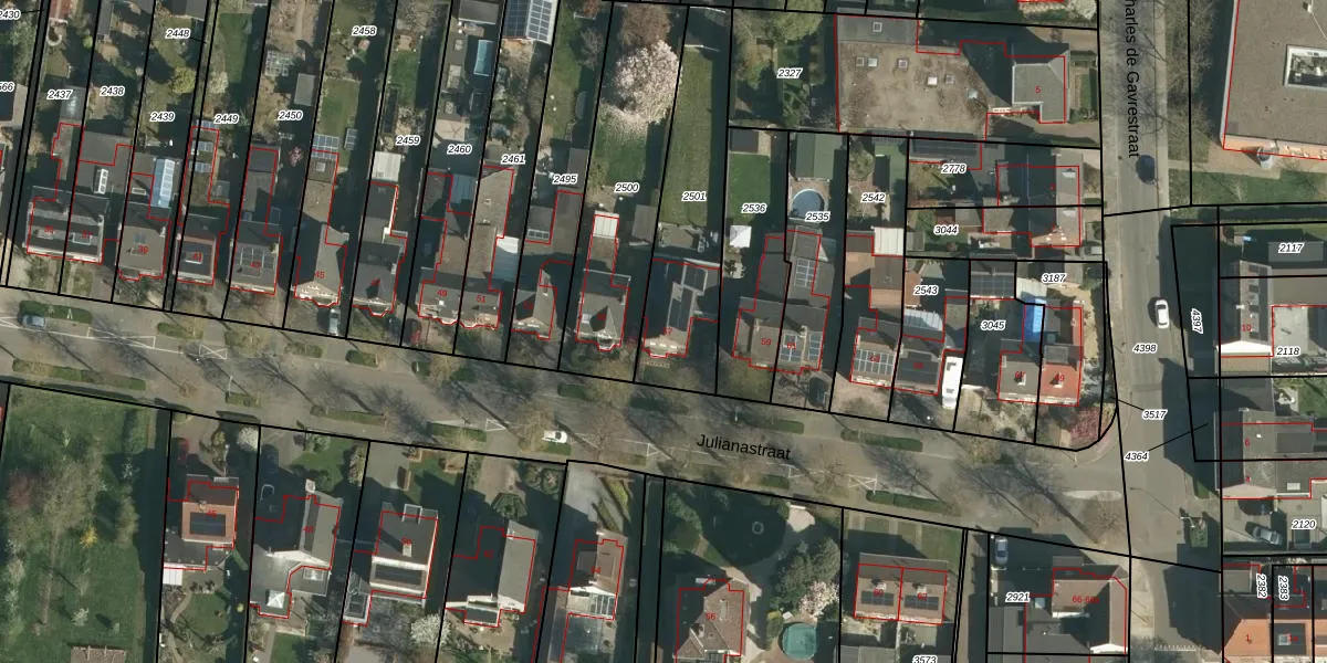 Het perceel waarop Julianastraat 57 staat heeft een oppervlakte van 550 m². Dit is een groot perceel. De perceeloppervlakte wordt geregistreerd door het Kadaster. Gedetailleerde informatie over de maten van dit perceel kunt u vinden in het rapport Kadastrale kaart met maatvoering van Julianastraat 57.