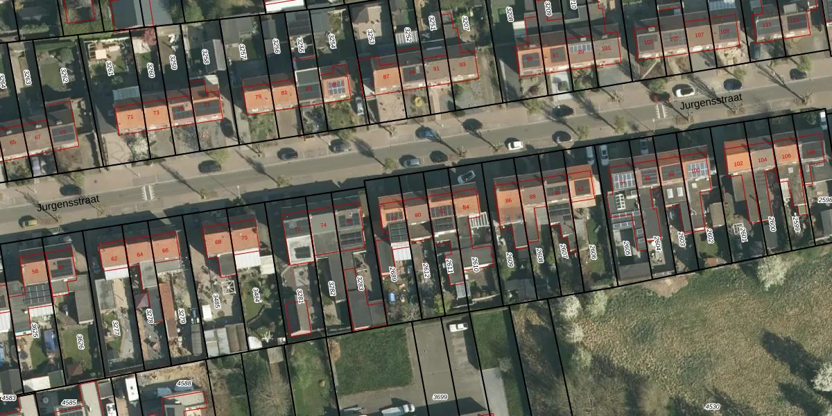 Het perceel waarop Jurgensstraat 80 staat heeft een oppervlakte van 198 m². Dit is een middelgroot perceel. De perceeloppervlakte wordt geregistreerd door het Kadaster. Gedetailleerde informatie over de maten van dit perceel kunt u vinden in het rapport Kadastrale kaart met maatvoering van Jurgensstraat 80.