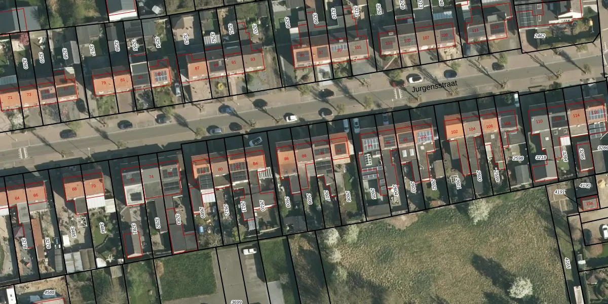 Het perceel waarop Jurgensstraat 88 staat heeft een oppervlakte van 201 m². Dit is een middelgroot perceel. De perceeloppervlakte wordt geregistreerd door het Kadaster. Gedetailleerde informatie over de maten van dit perceel kunt u vinden in het rapport Kadastrale kaart met maatvoering van Jurgensstraat 88.