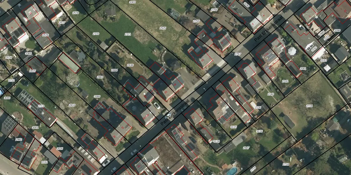 Het perceel waarop Past Erckensstraat 18 staat heeft een oppervlakte van 1084 m². Dit is een zeer groot perceel. De perceeloppervlakte wordt geregistreerd door het Kadaster. Gedetailleerde informatie over de maten van dit perceel kunt u vinden in het rapport Kadastrale kaart met maatvoering van Past Erckensstraat 18.