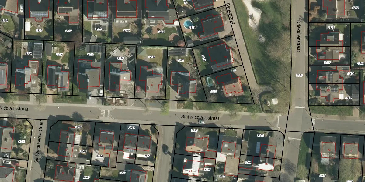 Sint Nicolaasstraat 13 is gelegen op kadastraal perceel ELO00C3321. Deze kadastrale aanduiding is uniek en wordt gebruikt door het Kadaster om eigendomsrechten en andere zakelijke rechten vast te leggen. Het perceel maakt onderdeel uit van de kadastrale gemeente Elsloo.