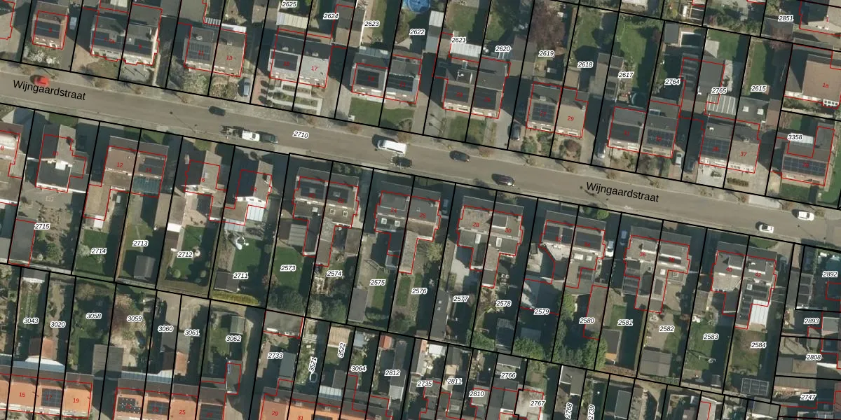 Het perceel waarop Wijngaardstraat 26 staat heeft een oppervlakte van 377 m². Dit is een groot perceel. De perceeloppervlakte wordt geregistreerd door het Kadaster. Gedetailleerde informatie over de maten van dit perceel kunt u vinden in het rapport Kadastrale kaart met maatvoering van Wijngaardstraat 26.