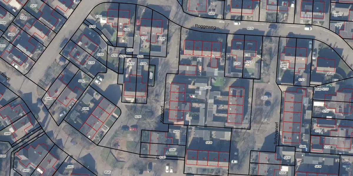 Het perceel waarop Korenerf 14 staat heeft een oppervlakte van 2075 m². Dit is een zeer groot perceel. De perceeloppervlakte wordt geregistreerd door het Kadaster. Gedetailleerde informatie over de maten van dit perceel kunt u vinden in het rapport Kadastrale kaart met maatvoering van Korenerf 14.
