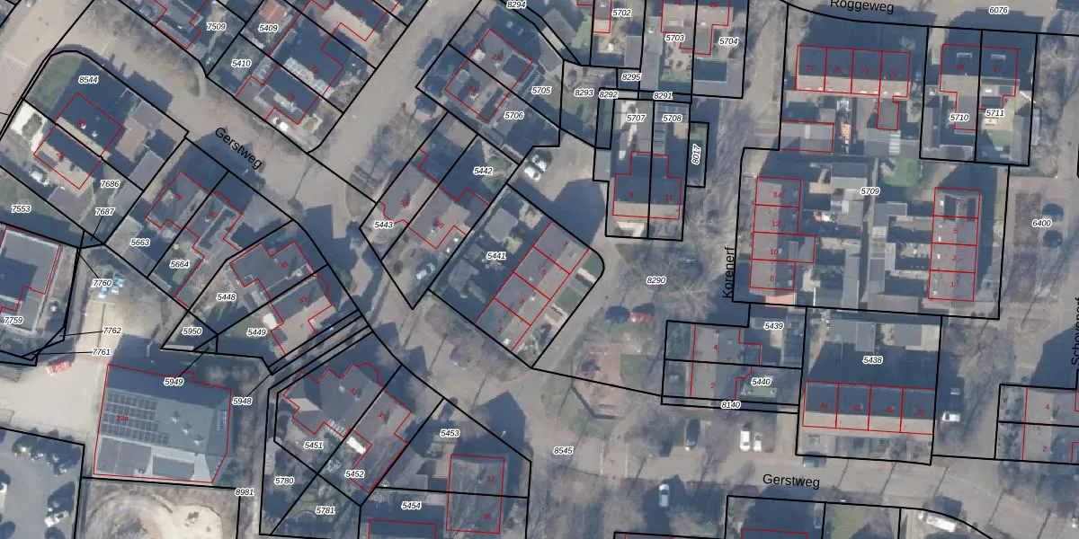 Het perceel waarop Korenerf 5 staat heeft een oppervlakte van 592 m². Dit is een groot perceel. De perceeloppervlakte wordt geregistreerd door het Kadaster. Gedetailleerde informatie over de maten van dit perceel kunt u vinden in het rapport Kadastrale kaart met maatvoering van Korenerf 5.