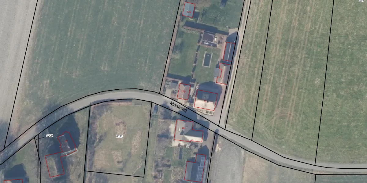 Het perceel waarop Maatweg 17-a staat heeft een oppervlakte van 5310 m². Dit is een zeer groot perceel. De perceeloppervlakte wordt geregistreerd door het Kadaster. Gedetailleerde informatie over de maten van dit perceel kunt u vinden in het rapport Kadastrale kaart met maatvoering van Maatweg 17-a.