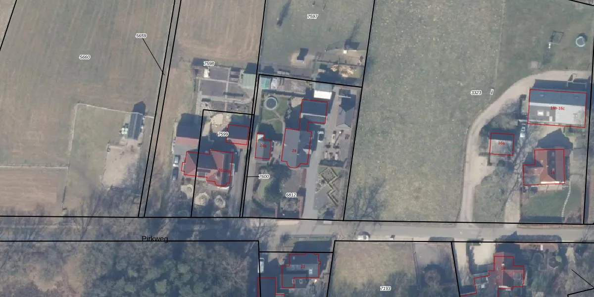Het perceel waarop Pirkweg 24 staat heeft een oppervlakte van 1640 m². Dit is een zeer groot perceel. De perceeloppervlakte wordt geregistreerd door het Kadaster. Gedetailleerde informatie over de maten van dit perceel kunt u vinden in het rapport Kadastrale kaart met maatvoering van Pirkweg 24.