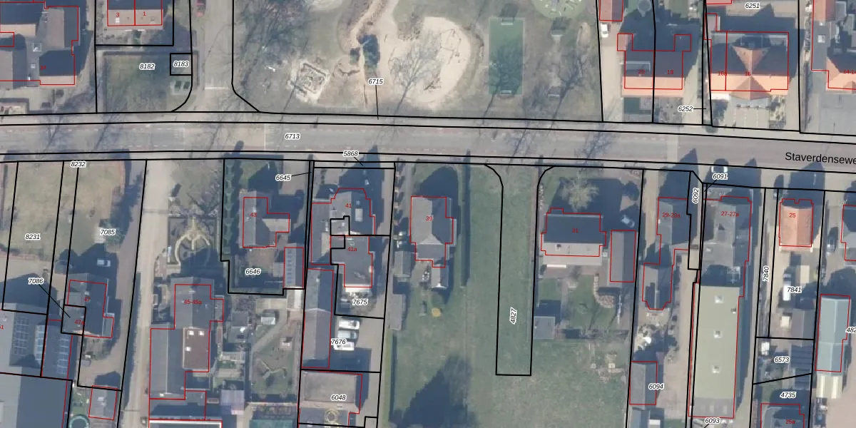 Het perceel waarop Staverdenseweg 39 staat heeft een oppervlakte van 4630 m². Dit is een zeer groot perceel. De perceeloppervlakte wordt geregistreerd door het Kadaster. Gedetailleerde informatie over de maten van dit perceel kunt u vinden in het rapport Kadastrale kaart met maatvoering van Staverdenseweg 39.
