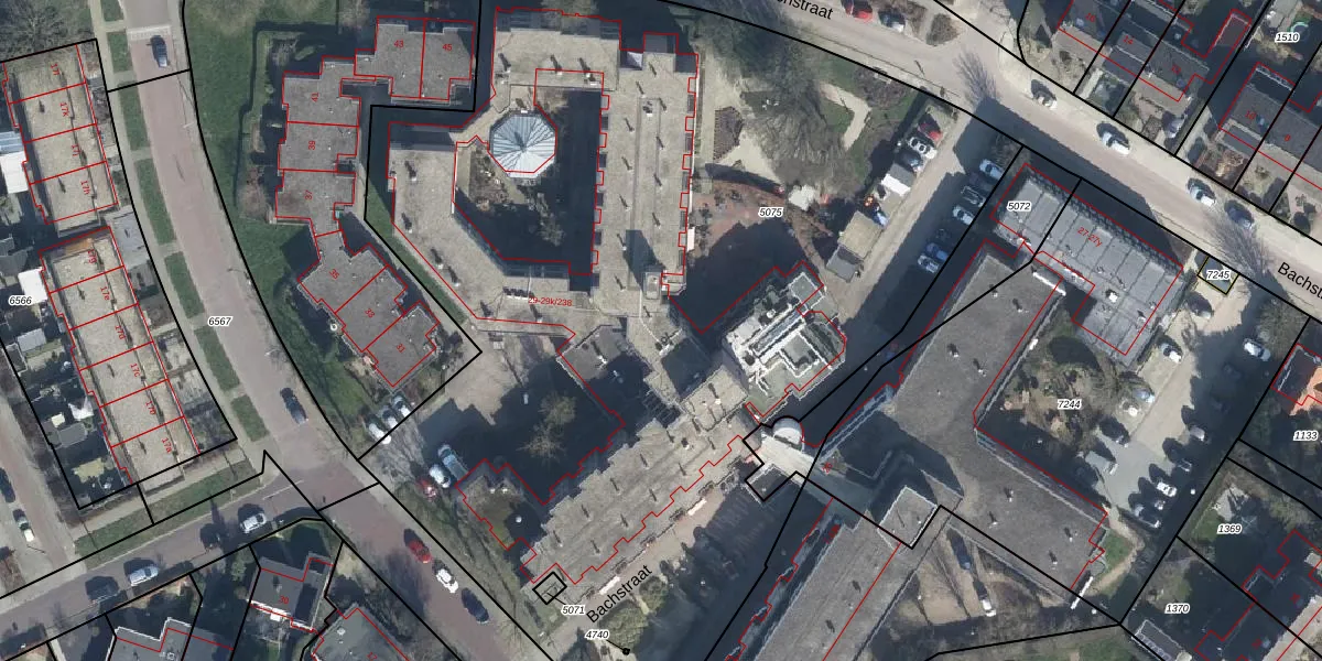 Het perceel waarop Bachstraat 29-k-040 staat heeft een oppervlakte van 6556 m². Dit is een zeer groot perceel. De perceeloppervlakte wordt geregistreerd door het Kadaster. Gedetailleerde informatie over de maten van dit perceel kunt u vinden in het rapport Kadastrale kaart met maatvoering van Bachstraat 29-k-040.